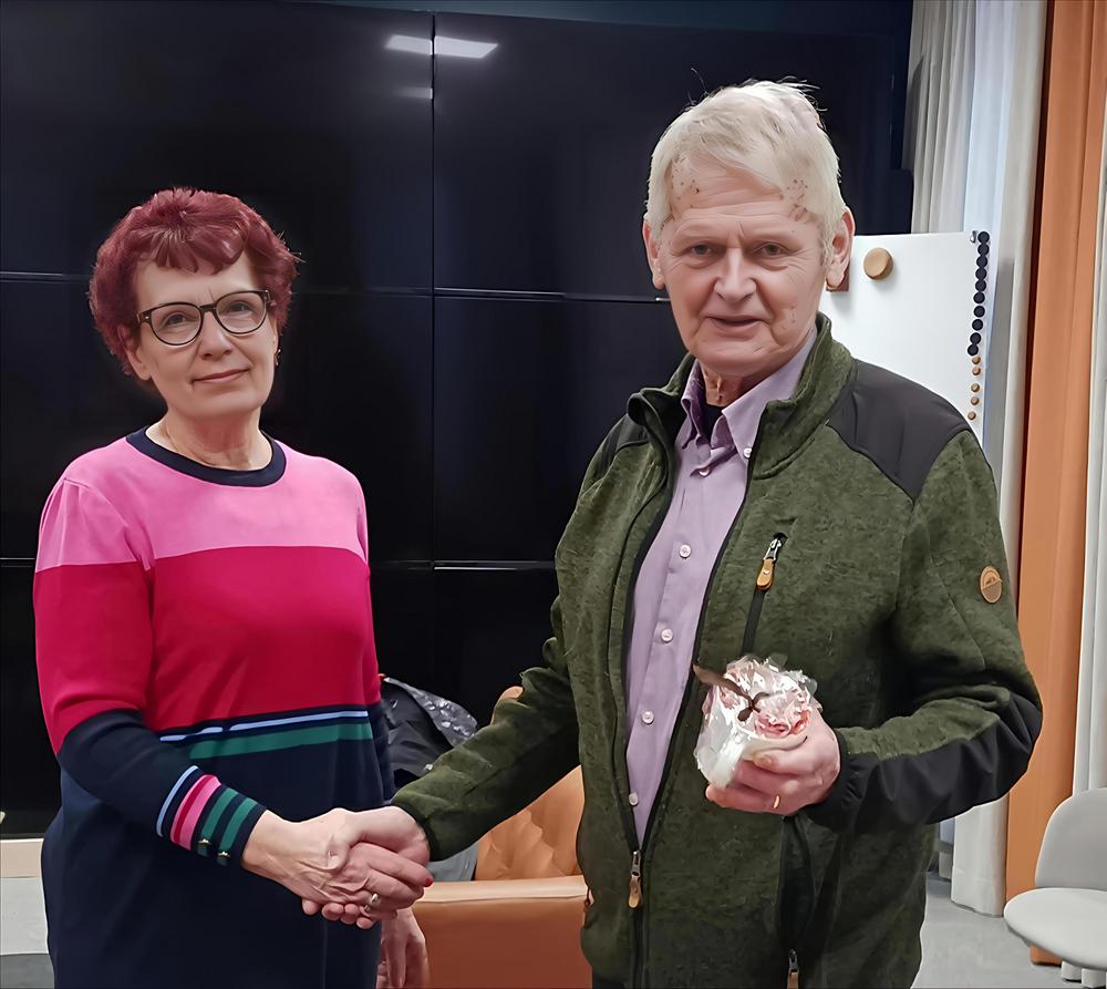 Pyhtään Senioreiden varasihteeri Anja Suur-Uski ojensi Teppo Sainiolle Pyhtää-mukin muistoksi mukavasta vierailusta ja erittäin mielenkiintoisesta tuote-esittelystä.